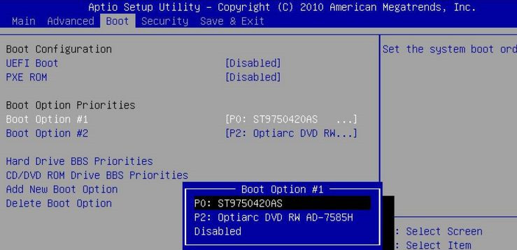 2、同样的按↓移动到1st Boot Device,回车,会弹出一个Options小对话框,里面是所有的启动项,以下图为例,WDC WD5000AAKX就是表示硬盘,选择它回车,最后按F10,在弹出的对话框选择yes回车保存即可。